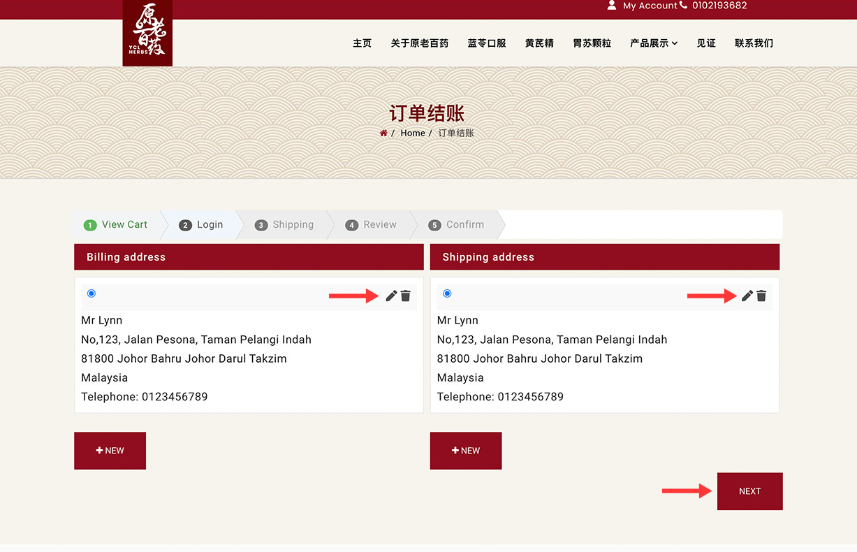 Choose your billing/shipping address. You can also edit them with the pen icon. Click "Next" button to proceed once you're done.、