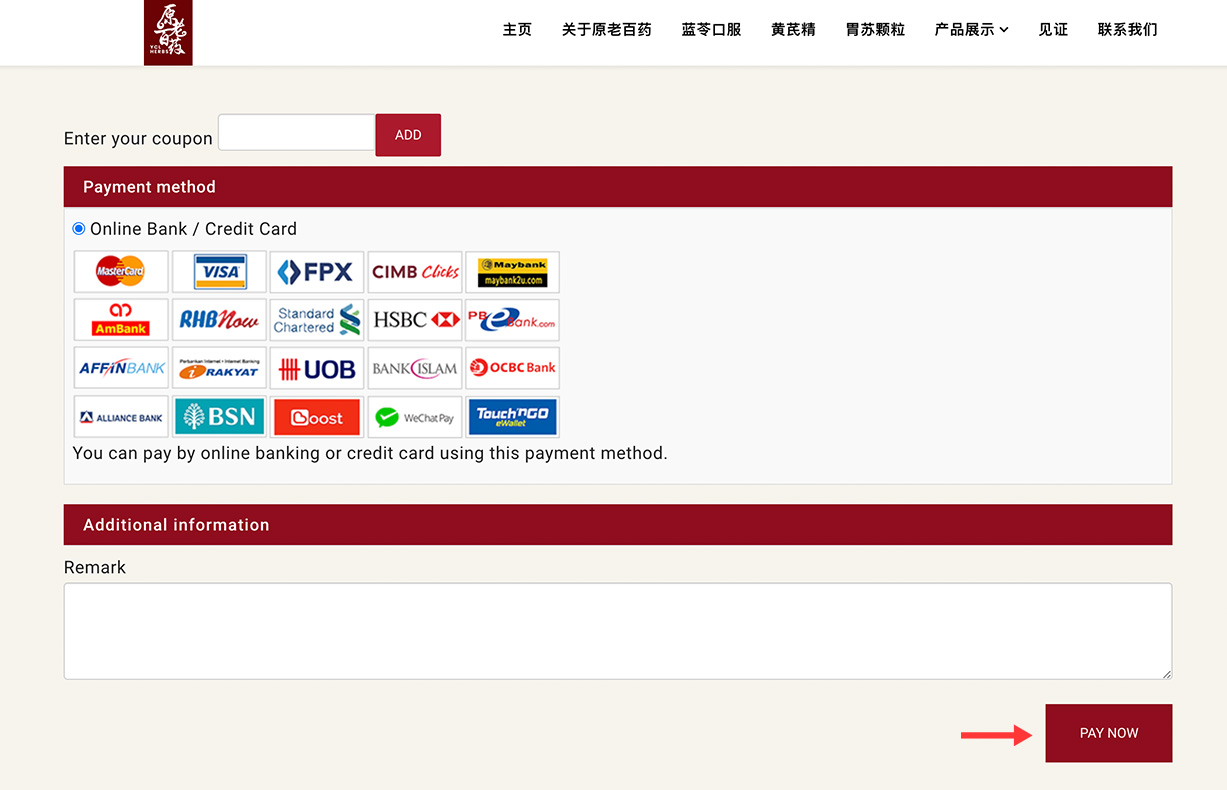 Confirm your order and click the "PAY NOW" button to end your purchase. You can enter the coupon number if available.
